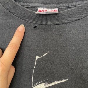 Vintage condition *black faded, cracking graphic. 2 holes-see photos. Vintage patina style