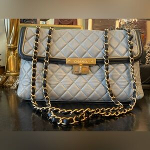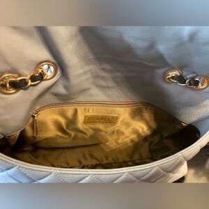 Elevate your style with this elegant Chanel quilted leather bag. Featuring a sophisticated gray color, this bag is perfect for any occasion. The iconic chain strap adds a touch of luxury to your ensemble. Base length 11.25 in, width 3 in, height 6.5 in, drop 11.5 in, drop 21.5 in