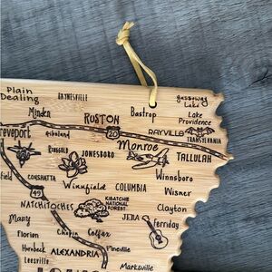 Celebrate life in The Pelican State with the Totally Bamboo Destination Louisiana State Shaped Serving and Cutting Board! This beautifully crafted bamboo cutting board is shaped to the outline of the great state of Louisiana, and features laser-engraved artwork of all the top cities, places and attractions. It's a great way to add a bit of local flavor to your charcuterie or appetizer spread. The reverse side of the board is blank and provides an ideal, knife-friendly cutting surface. When not in use, the included hang tie allows the board to double wonderfully as wall art to show off your love of Louisiana in the kitchen, dining room or den. The Destination Louisiana Board also makes an outstanding gift for birthdays, housewarmings, Christmas or any occasion! Hand wash only; measures 13" × 12" × 5/8". From a smoke and pet free home. Never used.