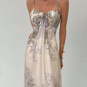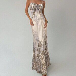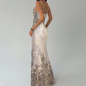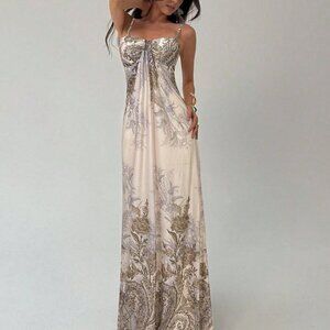 Elevate your style with this elegant maxi slip dress, featuring a khaki floral print that captures a garden-inspired charm. The regular fit offers comfortable movement, while the high waist and mermaid‑shaped hem create a graceful silhouette. Delicate spaghetti straps and puff sleeves add a romantic touch, and a fully lined interior ensures modesty and a smooth feel against the skin. Perfect for occasions where you want to stand out with effortless sophistication.