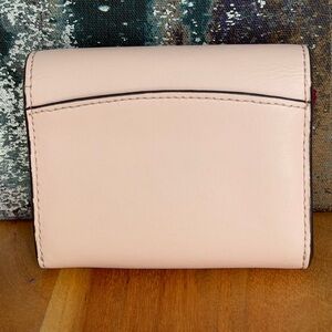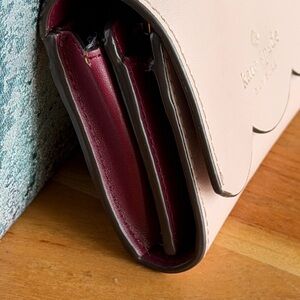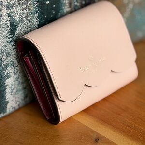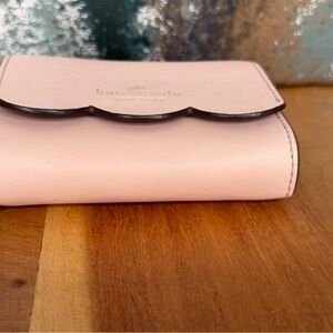 Crafted from luxurious smooth leather in a delicate "Rose Smoke" (light pink) hue, this wallet is as stylish as it is functional. The signature scalloped edge adds a touch of playful sophistication.