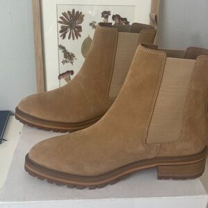 Stylish tan heeled boots by Quince. Elegant design with a sturdy heel. Perfect for any occasion.