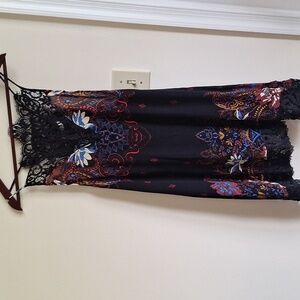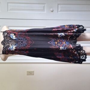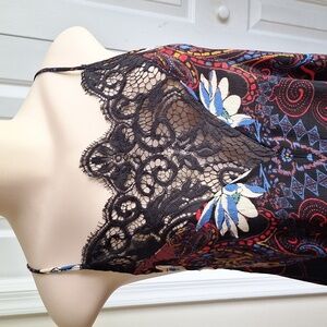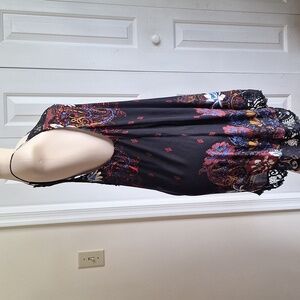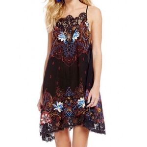 Free People, Who's Sorry Now, slip dress, mini dress, size medium, lace trim, eyelash lace, racerback, plunge neck, sheer chiffon, paisley print, floral print, boho, bohemian, festival wear, layering dress, summer dress, lightweight, airy, flowy, feminine, romantic, delicate, 100% rayon, Intimately Free People, designer, trendy, effortless, casual, date night, beach coverup, lingerie style, vintage inspired, nightgown style, soft, breathable, dark floral, black lace, multi-color, spring fashion, spring break style, resort wear.