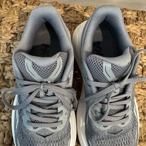 Hoka Bondi 9 Running Shoes. Gray, black, and white. Love them but need one size up. Worn only a few times so basically new.