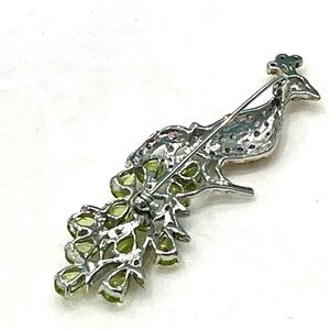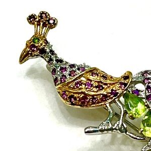 This exquisite peacock displays 12 genuine 0.5 ct peridots in her tail. Garnet covers her all over. The metal is 925 sterling silver plated with yellow and white gold. Just imagine someone creating this stunning brooch!!