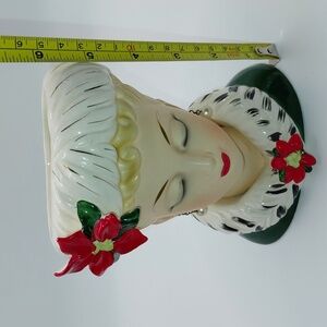 Vintage Inarco Lady Headvase. Very good vintage condition. Some age related light crazing to finish. Moderate discoloration to interior. Missing 1 leaf on Pointsettia on collar. Hand painted. Original earrings, adornment on hat. Dated 1961. Japan. Please review photos to confirm condition.
