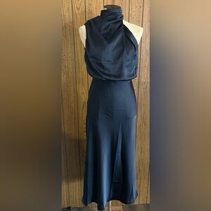 Chic navy dress with asymmetric neckline. Sleeveless and midi length. Back zip and button closure. Soft satin feel.Petal and Pup Annabelle halter neck midi dress navy size xs. Vendor tags were cut out .