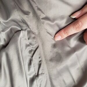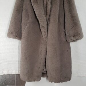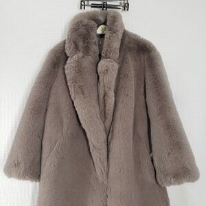 Gray faux fur long coat, Women's Large from H&M. This sophisticated taupe piece features a fluffy oversized collar and knee-length silhouette for added warmth and style. Finished with a notch lapel, concealed hook-and-eye closure, satin lining, and two side slash pockets—ideal for both evenings out and polished daytime wear.
