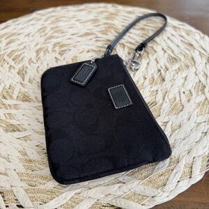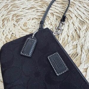 This authentic COACH Signature Jacquard wristlet wallet features classic monogram jacquard fabric with leather trim, designed in a timeless vintage Y2K style. it’s the perfect size for carrying essentials as a mini clutch or everyday wristlet.