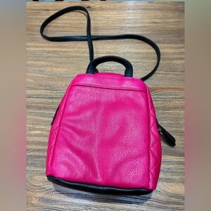Chic backpack with striking pink and black design. Front zip pocket and adjustable strap. Perfect for daily adventures.