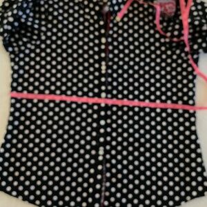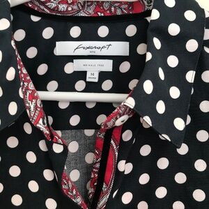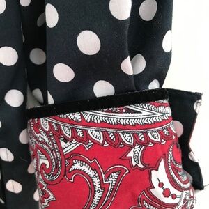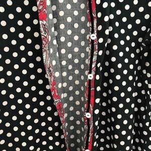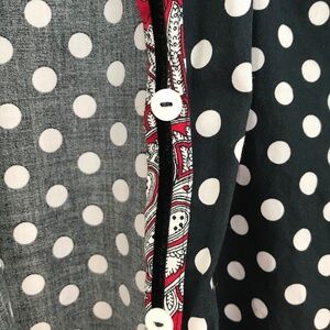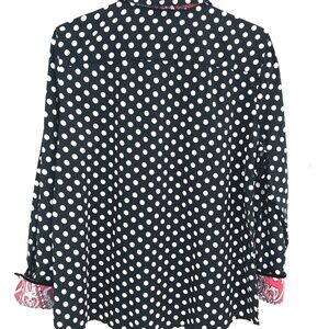 Foxcroft NYC women's button down shirt in size 14. Navy with white polka dots and red paisley on collar and cuffs. Top is "wrinkle free" and "shaped". There are slits on either side and a slight scallop to hem at waist. There is a black velvet strip at collar and cuff as well as on trim at button closure. 100% cotton, exquisite craftsmanship. There is a small pink discolouration to right of side slit as seen in photos.