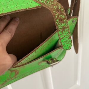 This crackle green distressed satchel is the perfect crossbody bag. Neon green vintage style with a long adjustable strap and extra front pocket for lip gloss, mints, or whatever. There’s a little stain on the interior as pictured. The distressed style is on purpose!