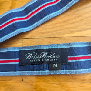 Brooks Brothers belt, size M, features a woven fabric construction with a blue base and alternating thin red and light blue stripes. It has a silver-tone metal buckle and a pointed end. The belt is in good condition. The label clearly indicates "Brooks Brothers" and "M" for size.