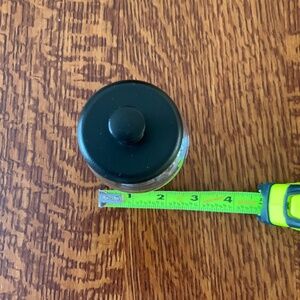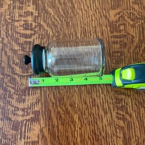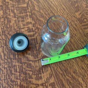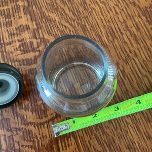 Jar is clear glass, airtight cap is black metal. See photos for size and condition
