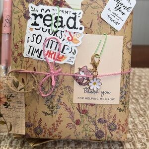 Blind date with a book 2 paperback books, fantasy romance, contains goodies, such as a pin stickers, bookmarks, tea, card, and charm