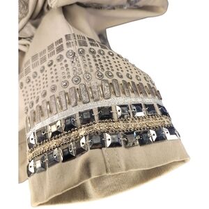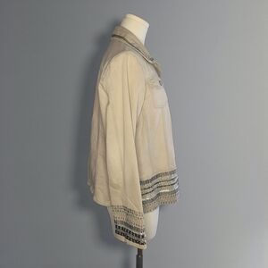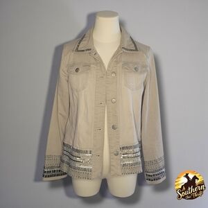 Chico's jean jacket in beige with striking silver embellishments. Stylish and versatile.