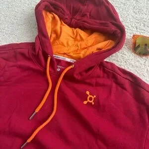Burgundy hoodie featuring orange accents from Orangetheory. Ideal for active wear. Size small