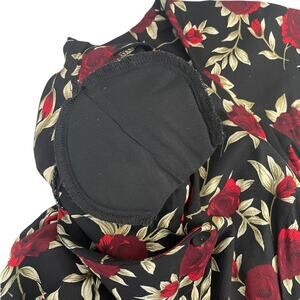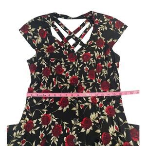 Beautiful rayon floral midi dress with a full button front. V-neckline, short cap sleeves, criss cross back detail, tie back detail. Black and red. Size 10. Please see photos for measurements.