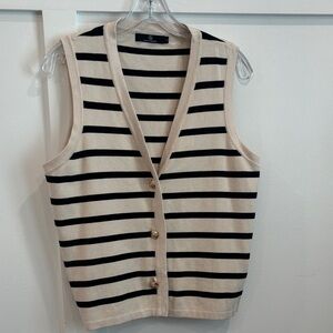 Chic sleeveless sweater vest with classic black and cream stripes. Perfect for layering and adding a touch of elegance to any outfit.