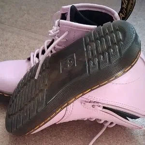 Chic light pink combat boots with sturdy lace-up design. Iconic Dr. Martens style.