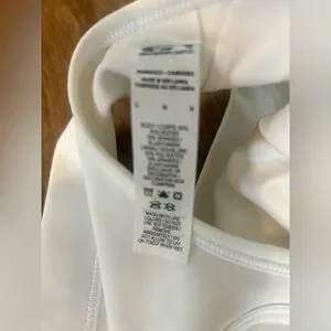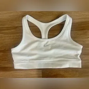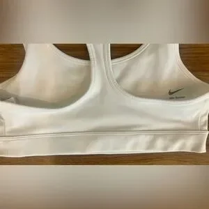 Sleek white sports top with Nike swoosh. Comfortable Dri-FIT fabric.