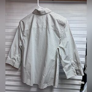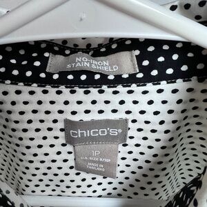 This is a Chico's No-Iron button-down shirt featuring a white base with black polka dots.