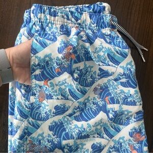 Make a splash with these stylish ocean wave print swim trunks. Featuring vibrant blue and orange hues, they're perfect for beach and pool adventures.