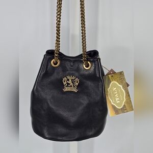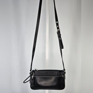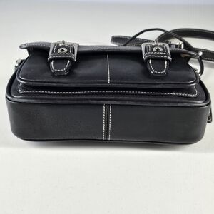 This vintage Coach Bleecker Leatherware 2-piece set includes the Mini Flap Crossbody Bag (style no. G30-9355) and the original matching Coach Leatherware wristlet, both crafted from smooth black glove-tanned leather with silver-tone hardware. The crossbody bag features contrast stitching, a classic flap-front silhouette with buckle detailing and an adjustable shoulder strap, while the coordinating wristlet provides a streamlined option for carrying essentials. This is a true matching set being sold together, not mixed or substituted.