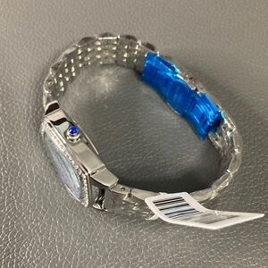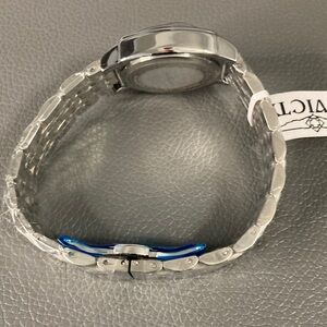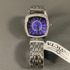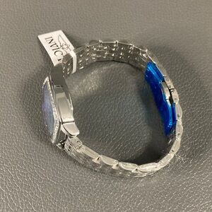 Stylish Invicta watch featuring a silver band and a deep blue dial. Accented with a crystal-studded bezel.