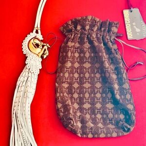 Elegant Roberto Cavalli necklace. Features gold and white design. Unique pendant with tassel detail.