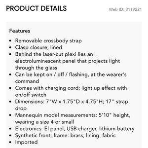 The Cancer constellation light-up electrical Zodiac clutch by REINE. Brand new, never used. Older style with the black interior instead of the current style that is beige. Clutch has a built in battery, comes with usb plug to recharge. Comes with a detachable gold chain so can be worn as a clutch or with a strap. Works perfectly! This bag is very well made with beautiful hardware and has some heft to it, so please be aware. Feel free to ask me any questions!