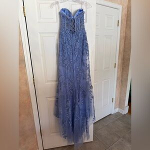 Sherri Hill elegant backless design in periwinkle blue. Intricate lace detailing. Perfect for formal events. Purchased new for $750 and worn once for prom. Had slight alterations, hemmed for 5’4” with 3” heels. Has a train with bustle.