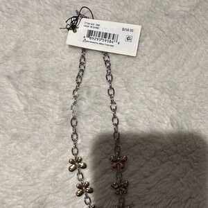 Stylish Coach necklace with floral accents. Features silver and gold tones. Ideal for any occasion.