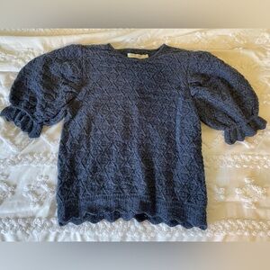 Elegant blue sweater with textured design. Features puff sleeves and scalloped edges. Perfect for casual wear.