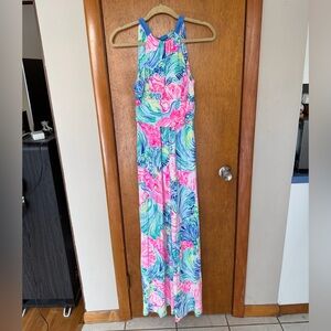 lilly pulitzer martina maxi, beach please print, lilly pulitzer halter dress, lilly resort maxi dress, tropical vacation dress, cruise outfit women, lilly pulitzer small, pink blue green maxi, palm beach style dress, colorful summer maxi, stretch waist maxi dress, island vacation outfit