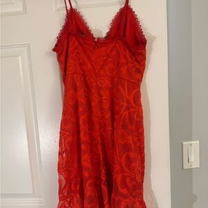 Elegant red lace dress. Features intricate floral patterns. Spaghetti straps with lace trim. Perfect for special occasions.