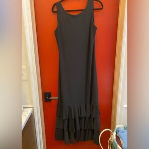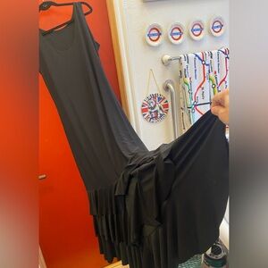 This elegant black sleeveless dress is perfect for any occasion. Its timeless design offers a flattering fit and versatile style. Pull on and triple ruffled bottom. Length hits mid calf. Perfect for flamenco practice or class or even performance. Nice great quality poly knit weight. Not cheap. Sacrifice. ( TOP SOLD SEPARATELY)