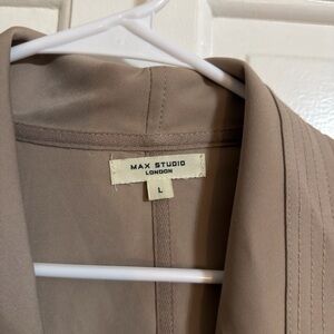 Elegant tan trench coat by Max Studio. Features a draped open front. Perfect for layering. Brand new never worn.