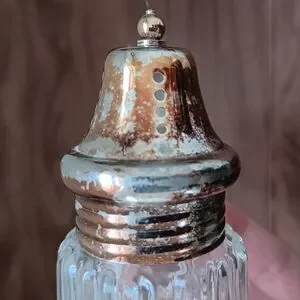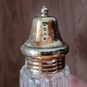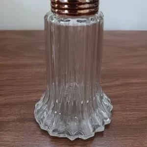 This elegant clear crystal glass salt or pepper shaker features a unique swirl design. Metal screw-on cap has a tarnished coppery color, which adds to its vintage look. See photos. Made in Japan.
