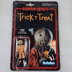 FUNKO REACTION action figure TRICK 'R TREAT Cult Horror Halloween Movie SAM. NV033. Please see all pictures, this is new still in box, box was damaged and plastic cover was taped. Says 3 3/4" figure but he only measures 2 1/4 roughly. I believe this is a 2014 figure, please see all pictures with detailed information printed on box.