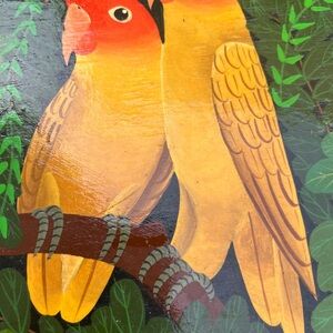 Vibrant tray featuring two parrots with red and yellow hues. Surrounded by lush green foliage.