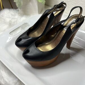 Elevate your style with these chic black leather slingback heels. Perfect for any occasion, these shoes offer both comfort and elegance.