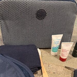 La Compagnie travel amenity kit with various accessories shoe bag , socks etc . Includes a blue eye mask, navy pouches, and assorted toiletries. Also included are delta cosmetic bag with toothbrush kit , eye mask , ear plugs . Air France great First Class cosmetic bag with eye mask , socks & toothbrush . Plus revive anti aging , buccotherm protection, Clarins beauty flash, Amouage existence miniature , Delina made in France, ROZ Santa Lucia styling for hair , Ex Nihilo Paris