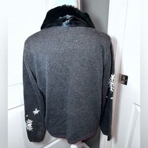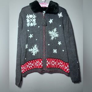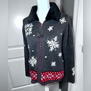 Beautiful Fashion Bug knit holiday sweater featuring embroidered snowflakes, a soft faux fur collar, and the cutest hand-style sewing details with bold red embroidery stitching throughout. Zip-front design with tassel pull adds extra charm. Cozy, festive, and perfect for winter layering or holiday gatherings. A true statement holiday knit.