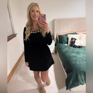 This elegant black dress features beautiful floral accents along the neckline, perfect for any occasion. Its classic design and sophisticated color make it a must-have in your wardrobe.