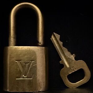 Stylish gold padlock featuring iconic LV logo. Perfect for securing accessories.