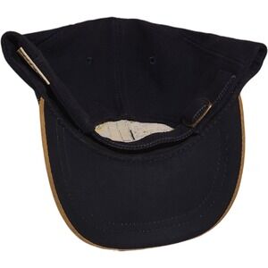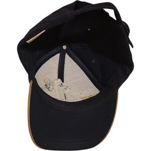 Old Course St Andrews golf embroidered baseball cap featuring a black crown and a tan suede brim. Embroidery includes golf clubs, the text "OLD COURSE ST. ANDREWS", and a crest. Adjustable buckle closure at the back ensures a customizable fit. The interior features a label from International Insignia.