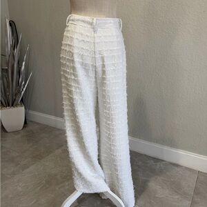 Polished Amanda Uprichard white tweed-esque pants, size Medium. Designed with a structured yet wearable silhouette, featuring two gold button accents — one on each pocket — for a refined, classic finish. The textured fabric elevates the look while remaining versatile and easy to style.