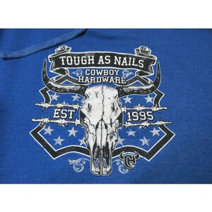 Cowboy Hardware Men's Tough As Nails Skull Graphic Hooded Sweatshirt Blue. Size X Large. Hood has adjustable drawstrings, front kangaroo pocket, ribbed knit cuffs and hem. Heather Blue. Cool skull graphic. In excellent condition.