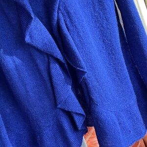 Elegant royal blue cardigan with ruffled edges. Open front design. Lightweight wool blend. Feminine. Minimal pilling in front.
